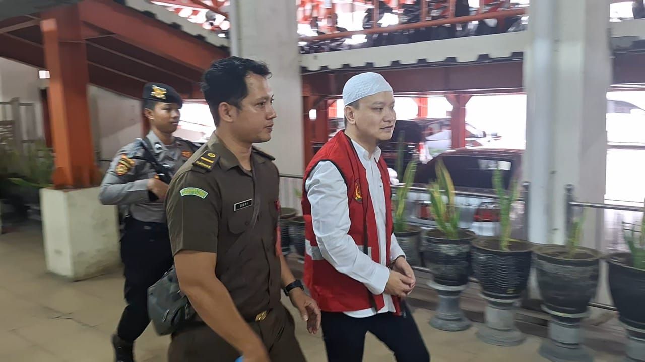 SURABAYA (Realita)- Ivan Sugiamto, terdakwa perundungan terhadap siswa sekolah SMA Kristen Gloria menjalani sidang perdana di Pengadilan Negeri (PN) Surabaya, Rabu (5/2/2025). Pria berusia 39 itu terlihat mengenakan peci putih dengan rompi tahanan warna merah saat tiba di PN Surabaya.