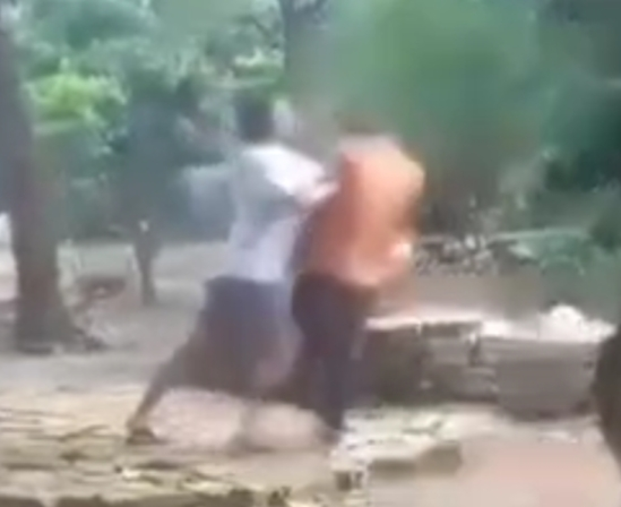 Dalam video tersebut, AM yang mengenakan kaos putih dan celana pendek terlihat mendorong seorang pria berbaju kuning bernama Jenal hingga keluar rumah.
