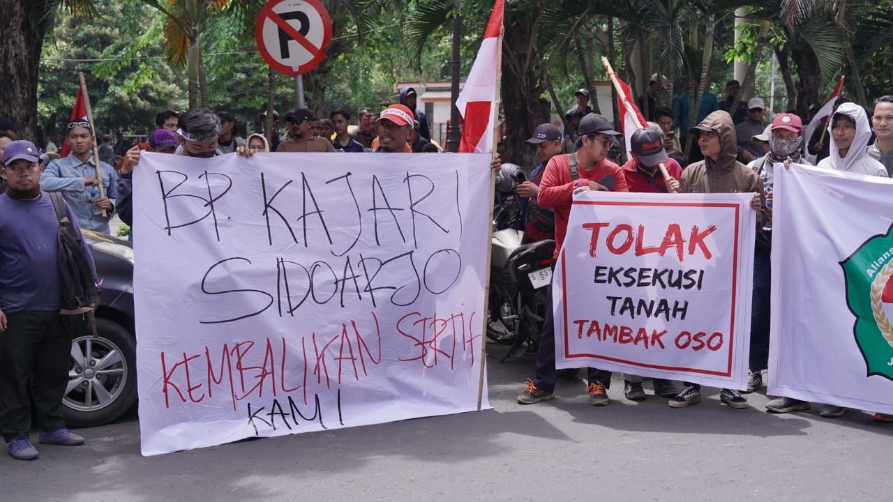 Kedua, pendemo meminta Kejaksaan Negeri Sidoarjo untuk menjalankan dan melaksanakan isi putusan Perkara Pidana No. 236 /Pid.b/2021/PN.Sda. Jo.873/PID/2021., jo.Putusan MARI no. 32 K/Pid/2022, jo. Putusan PK No. 21PK/Pid/2023 dalam kondisi telah Berkekuatan Hukum Tetap (Incrakht) dan mengembalikan status kepemilikan tanah kepada pemilik asal yang berhak yaitu Miftahur Roiyan dan Elok Wahibah.