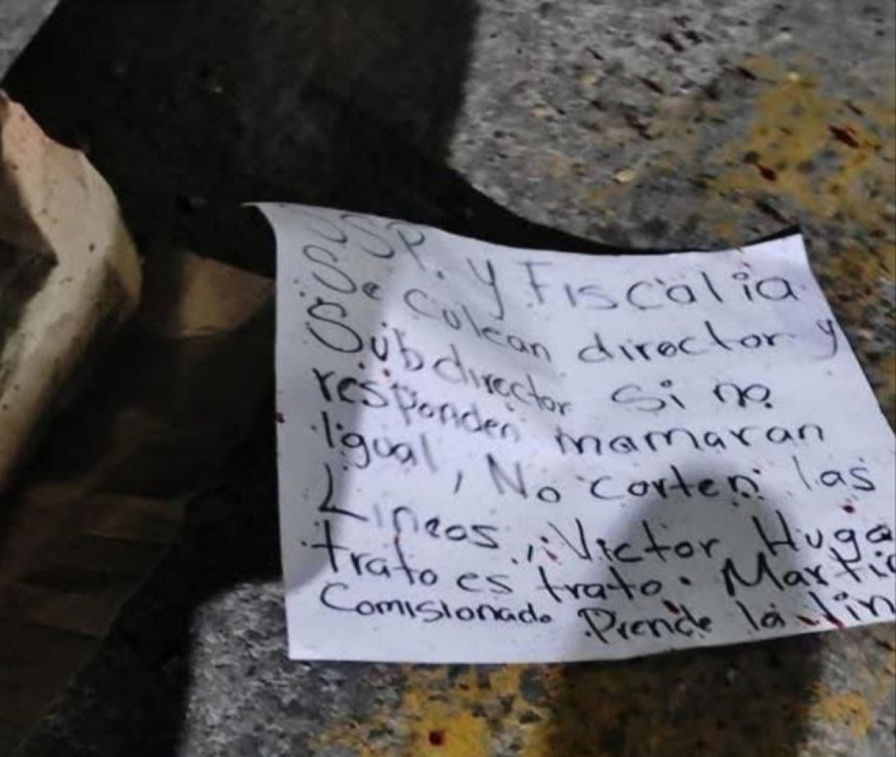 Pesan Narco yang ditujukan kepada Sekretariat Keamanan Publik dan Kantor Kejaksaan Agung Negara juga ditemukan di tempat kejadian perkara, pesan Narco itu ditulis oleh el señor 88 dari Kartel Generasi Baru Jalisco ( CJNG ). Menurut dugaan awal, ketiga jasad tersebut merupakan anggota La Barredora (mantan kartel Zetas)