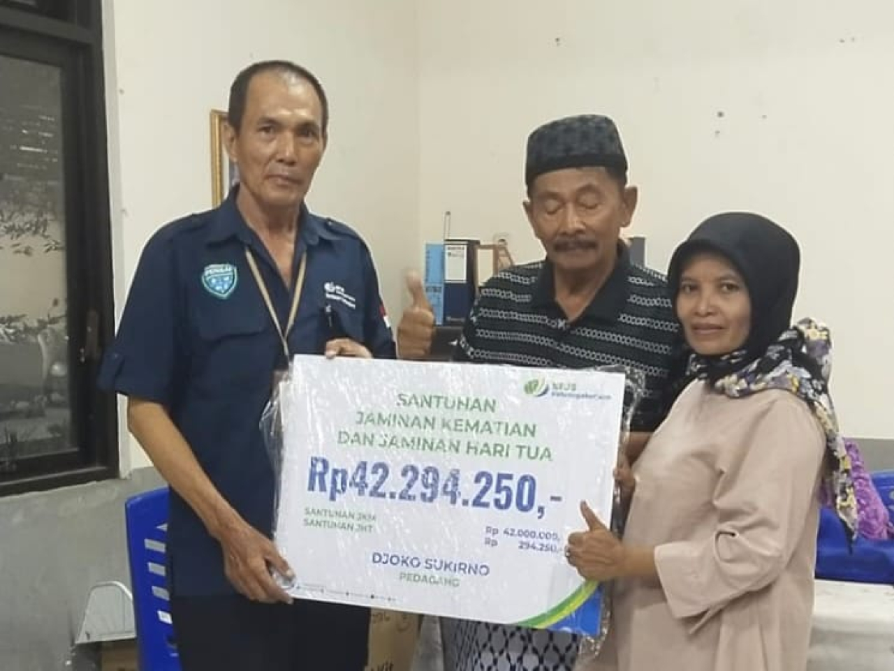 Manfaat kepesertaan BPJS Ketenagakerjaan yang diserahkan berupa Jaminan Kematian (JKM) sebesar Rp42.000.000,- dan Jaminan Hari Tua (JHT) sejumlah Rp294.250,-, sehingga total Rp42.294.250,-.