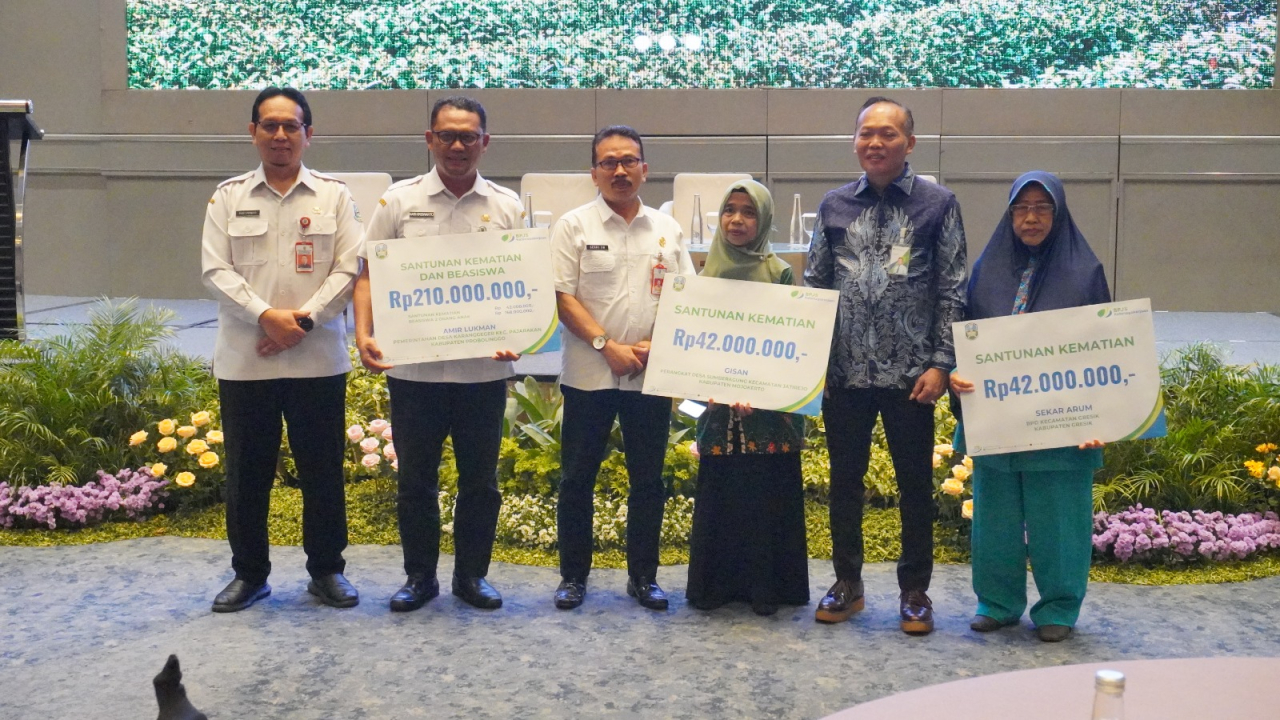 Dalam kegiatan ini dilakukan pula penyerahan simbolis manfaat program BPJS Ketenagakerjaan kepada ahli waris pekerja ekosistem desa. Manfaat yang diserahkan berupa Jaminan Kematian (JKM) dan beasiswa pendidikan ahli waris peserta. gan