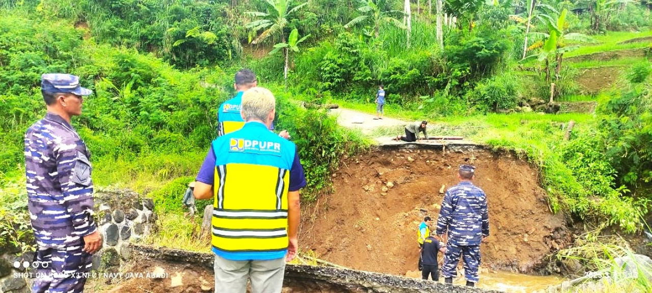 BANJARNEGARA (Realita) - Pangkalan TNI AL (Lanal) Cilacap dan Dinas Pekerjaan Umum dan Penataan Ruang (DPUPR) Kabupaten Banjarnegara, Jawa Tengah melakukan survei dengan identifikasi jembatan di Desa Kalibombong, Kecamatan Kalibening, Banjarnegara yang ambruk akibat diterjang banjir, Kamis (6/3) sore.