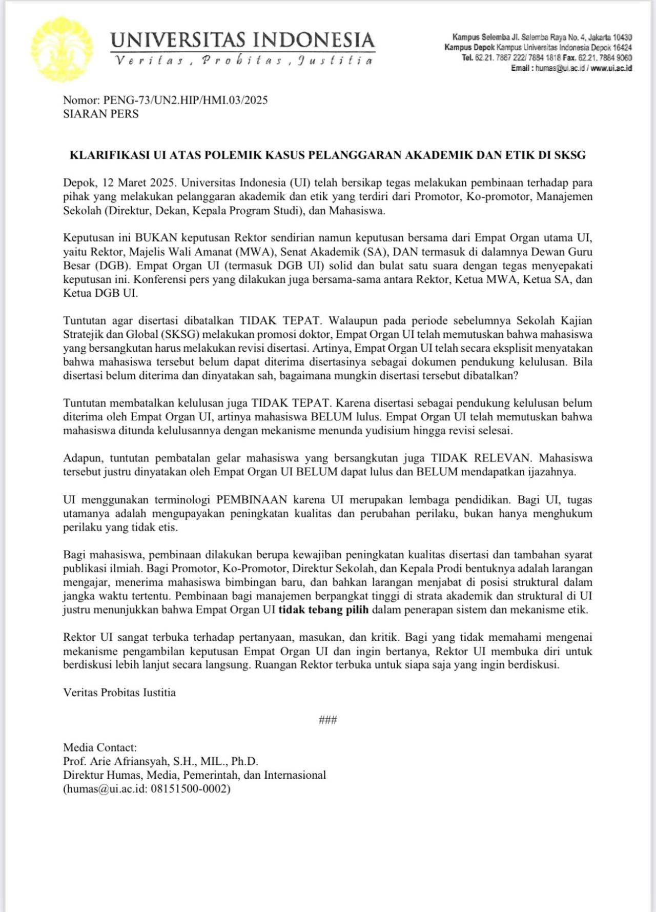 Menurut mereka, keputusan ini melukai martabat serta integritas UI dan dunia akademik Indonesia secara keseluruhan. Hingga Selasa (11/3), petisi tersebut telah mengumpulkan 2.262 tanda tangan.