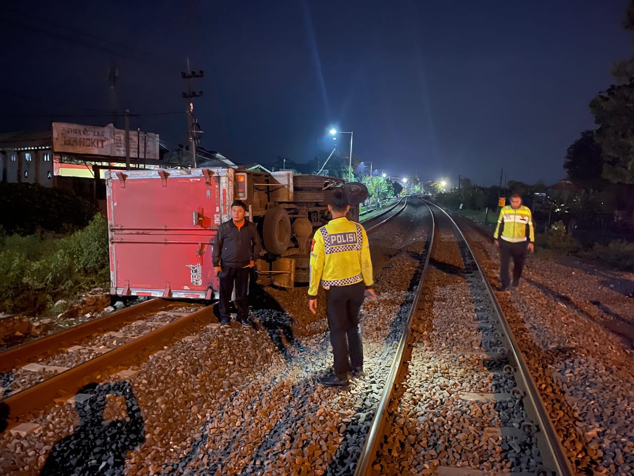LAMONGAN (Realita) - Truk dengan Nomor Polisi (Nopol) B-9883-FXW yang mengangkut makanan beku (sosis, nuget) terguling di perlintasan rel kereta api yang terletak di barat Terminal Lamongan, Jum'at (14/3/2025) dini hari, sekitar pukul 02.30 WIB.