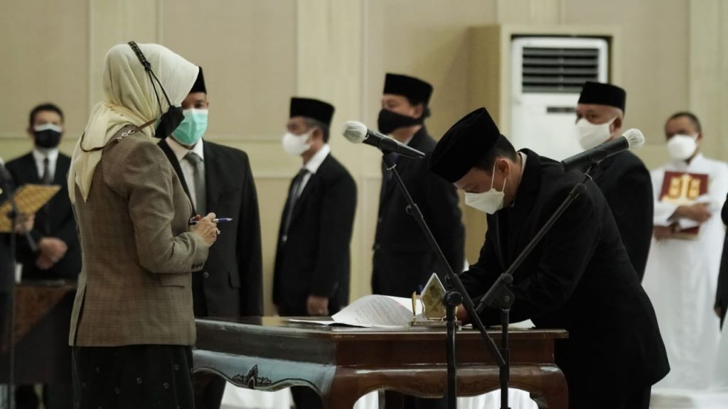 BATU (Realita)- Walikota Batu, Dewanti Rumpoko memimpin pelantikan dan pengambilan sumpah/janji jabatan, 40 pejabat Administrator, Pengawas, Fungsional dan Kepala Sekolah Kota Batu, di Graha Pancasila, Jumat (3/9/2021).