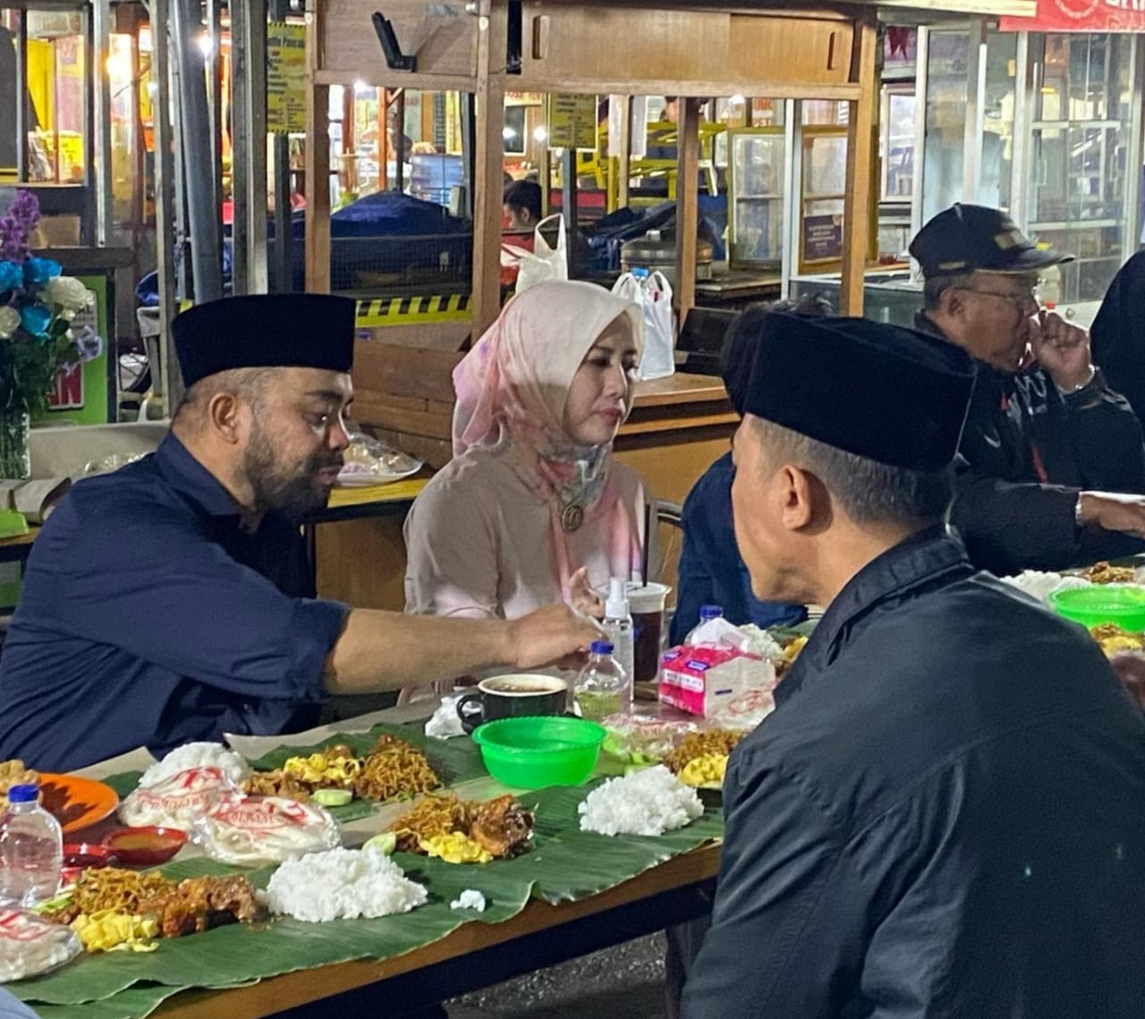 Buka bersama kali ini cukup unik dengan menggunakan alas daun pisang yang dikuti puluhan orang makan secara bersama-sama dengan penuh kekeluargaan meninggalkan kesan mendalam bagi Wawali maupun para pedagang.