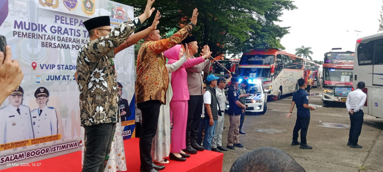 KAB.BOGOR (Realita)- Bupati Bogor, Rudy Susmanto melepas peserta mudik gratis angkutan lebaran tahun 2025/1446 Hijriah, yang dilaksanakan oleh Pemerintah Kabupaten (Pemkab) Bogor bersama Polres Bogor, di halaman parkir Stadion Pakansari, Cibinong, Jumat (28/3/2205).