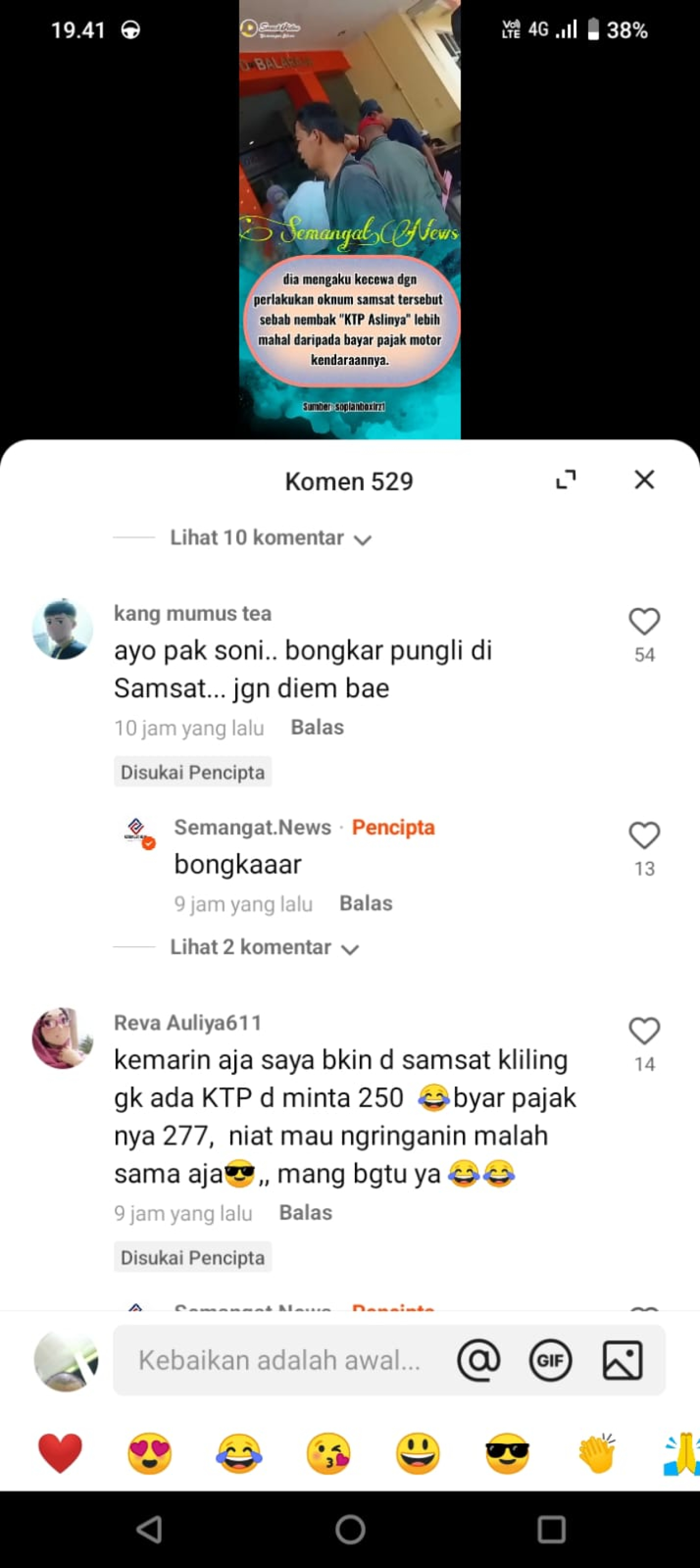 "Samsat Balaraja parah, banyak pegawe dalamnya yang jadi pungli. Masa gara2 gak ada KTP asli, diminta 300 RB, buat sanksi KTP, Gak ada KTP asli karna beli motor secon. Brati pajak sama sanksi KTP mahalan sanksinya. Gubernurnya sih ok lah, tapi pegawe nya parah2 manfaatin kesempatan," tulis pria dalam akun tersebut.