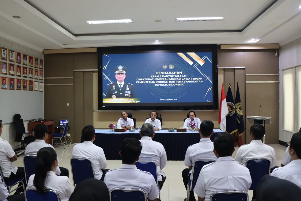 Kakanwil Ditjen Imigrasi Jawa Tengah, Is Edy Eko Putranto didampingi Kepala Bidang Intelijen dan Penindakan Keimigrasian Kanwil Jateng, Arief Yudistira memberikan pengarahan di Aula WIjaya Kusuma Kantor Imigrasi Cilacap.