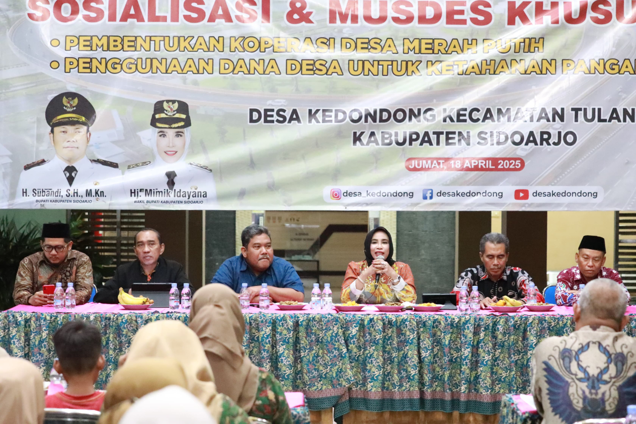 SIDOARJO (Realita) - Wakil Bupati Sidoarjo Hj. Mimik Idayana didampingi oleh Wakil Ketua DPRD Sidoarjo H. Kayan serta pejabat Dinas Koperasi dan Usaha Mikro Sidoarjo menghadiri acara Sosialisasi dan Musyawarah Desa terkait pembentukan Koperasi Desa Merah Putih serta penggunaan dana desa untuk ketahanan pangan di Balai Desa Kedondong, Kecamatan Tulangan, pada Jumat (18/4).