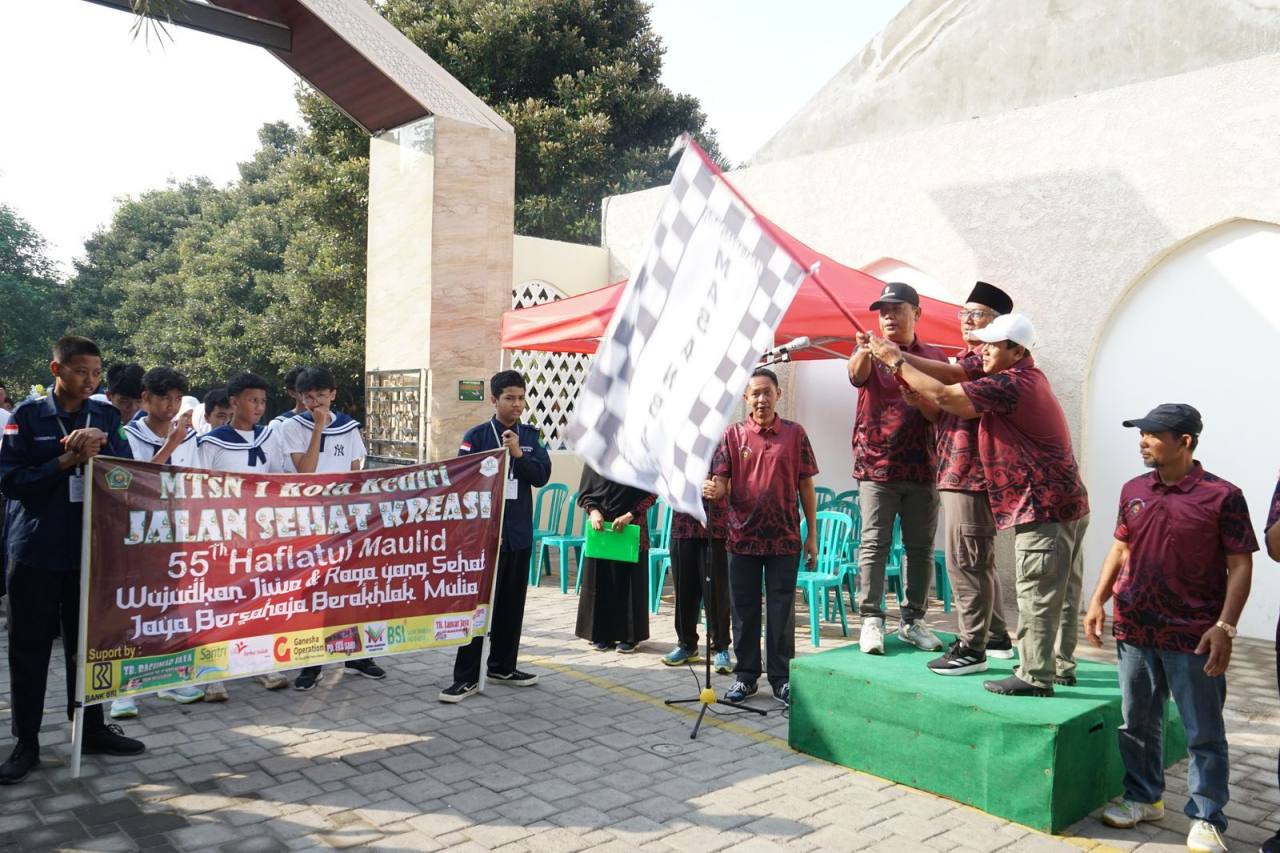 KEDIRI (Realita) - Wakil Wali Kota Kediri, Qowimuddin Thoha memberangkatkan Jalan Sehat Kreasi dalam rangka Haflatul Maulid ke-55 MTsN 1 Kota Kediri, Sabtu, 3 Mei 2025.