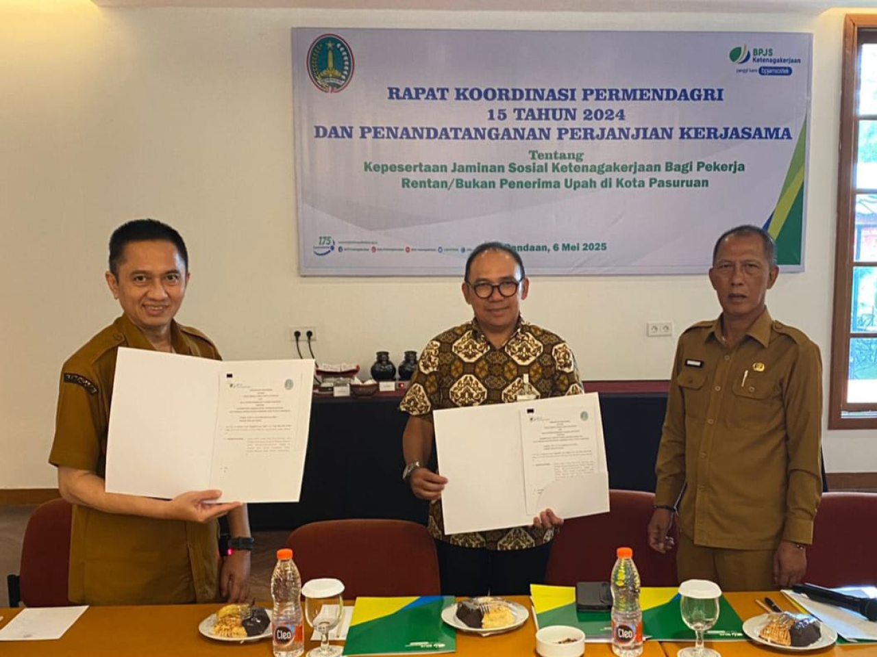 PASURUAN (Realita) - BPJS Ketenagakerjaan Cabang Pasuruan bersama Dinas Tenaga Kerja Kota Pasuruan melakukan penandatanganan kerja sama atas perlindungan pekerja rentan di wilayah Kota Pasuruan, Selasa (06/05/2025).