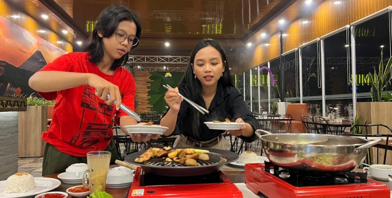 Saat kabut mulai turun perlahan, lantai atas hotel berubah menjadi ruang makan terbuka dengan kepulan asap dari panggangan. Pengunjung berkumpul, memanggang daging sapi, ayam, dan seafood segar ala Korean BBQ, sambil sesekali menyeruput kuah hangat dari Suki berisi jamur, sayuran, dan daging irisan tipis.