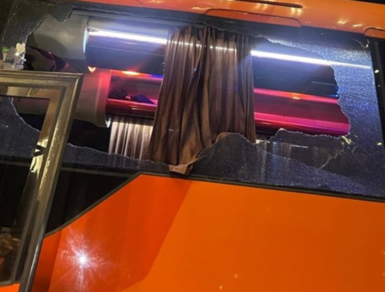 Bus rombongan Persik dilempari batu saat meninggalkan Stadion Kanjuruhan. Kaca bus bagian depan samping kiri pecah.