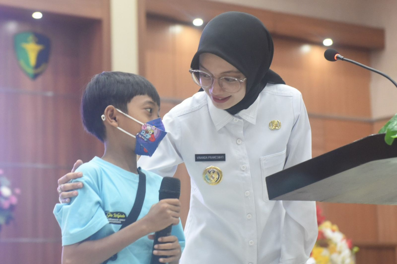 KEDIRI (Realita) - Wali Kota Kediri, Vinanda Prameswati berbagi kebahagiaan dengan para pejuang thalasemia dengan memberikan hadiah bingkisan berisi tumbler bagi anak-anak yang berhasil menjawab pertanyaannya.