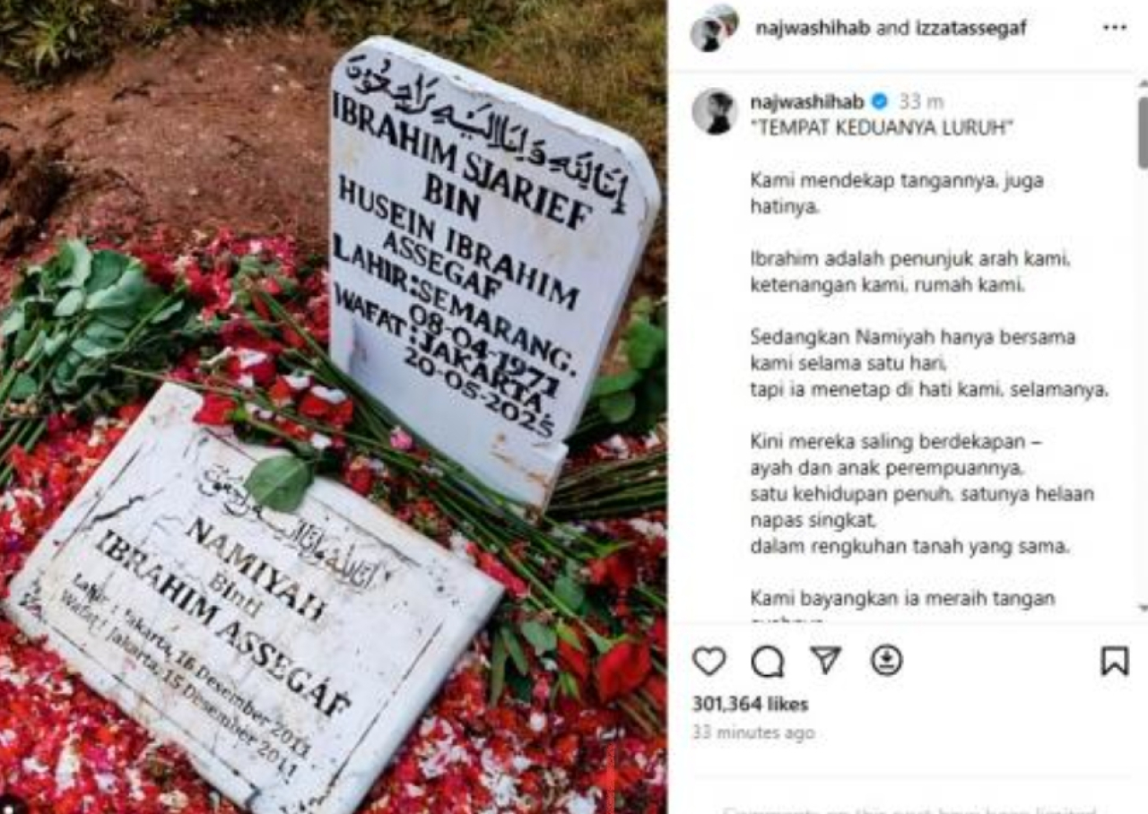Seperti diketahui suami Najwa Shihab, Ibrahim Sjarief bin Husein Ibrahim Assegaf, meninggal dunia pada Selasa (20/5/2025) pukul 14.29 WIB di RS Pusat Otak Nasional (RS PON), Jakarta. Pemakaman dilaksanakan pada Rabu (21/5/2025), pukul 10.00 WIB di TPU Jeruk Purut, Jakarta Selatan.oke