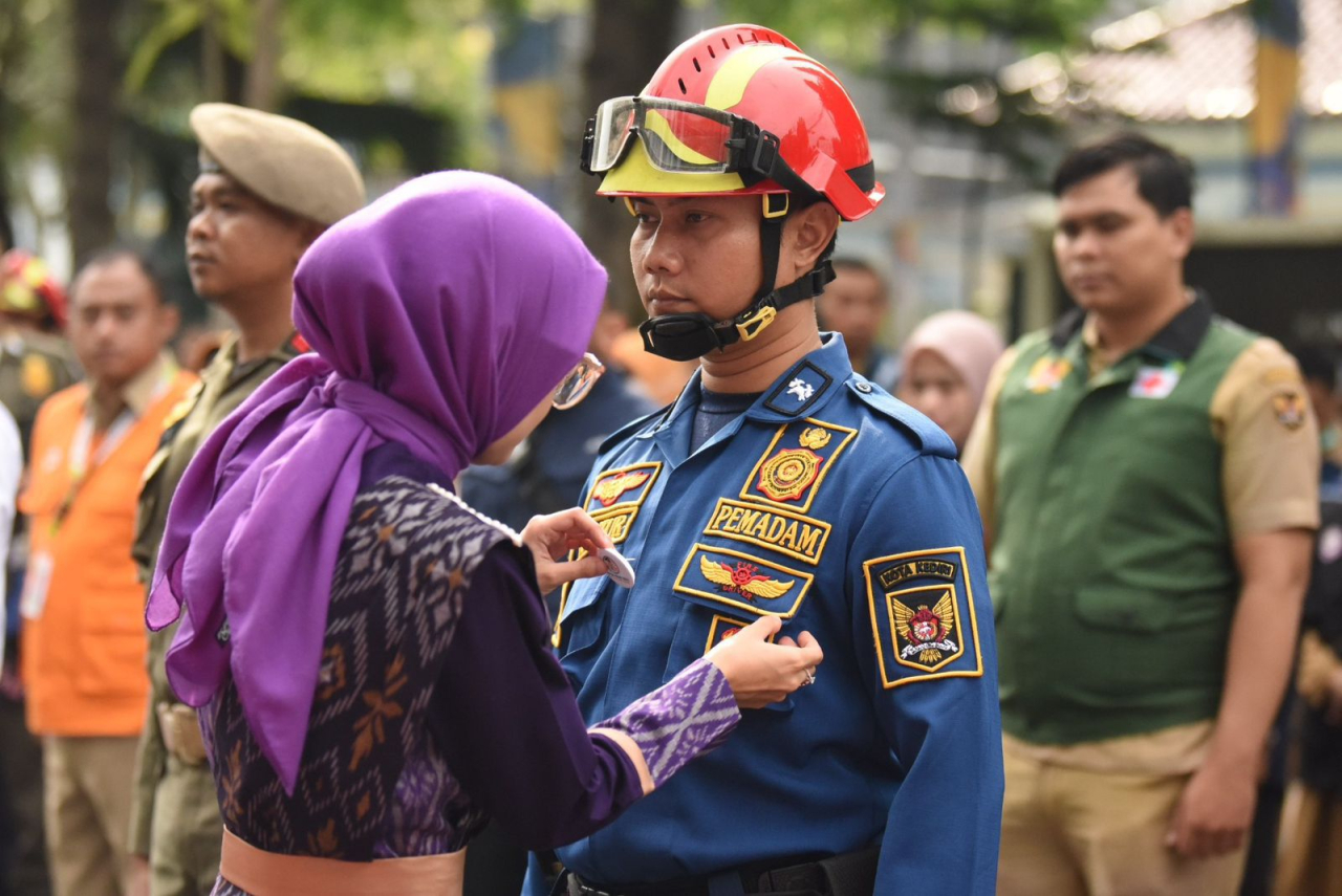 Wali Kota Kediri juga menyematkan pin kepada petugas 112 sebagai tanda pelepasan tugas yang terdiri dari personel Damkar, Satpol PP, Dishub, BPBD, Dinas Kesehatan, dan operator Call Center 112.