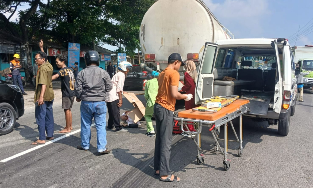 Sebuah sepeda motor yang ditumpangi pasangan suami istri terlibat tabrakan dengan truk tronton tangki semen curah hingga mengakibatkan satu orang tewas di tempat dan satu lainnya luka berat.