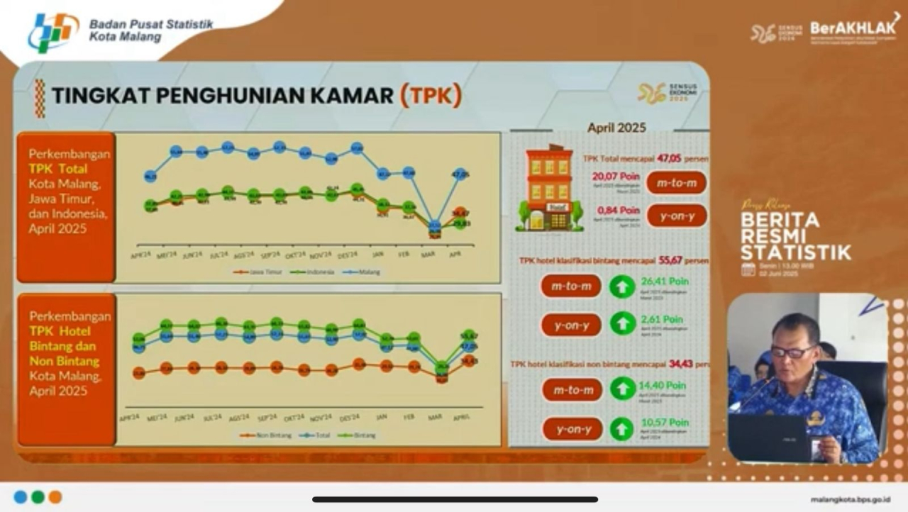Berdasarkan data BPS, TPK hotel di Kota Malang pada April 2025 mencapai 47,05 persen, meningkat 20,07 poin dibandingkan Maret 2025 yang sebesar 27,52 persen. Secara tahunan (year on year), angka tersebut juga naik 0,84 poin dibanding April 2024 yang tercatat 46,21 persen.