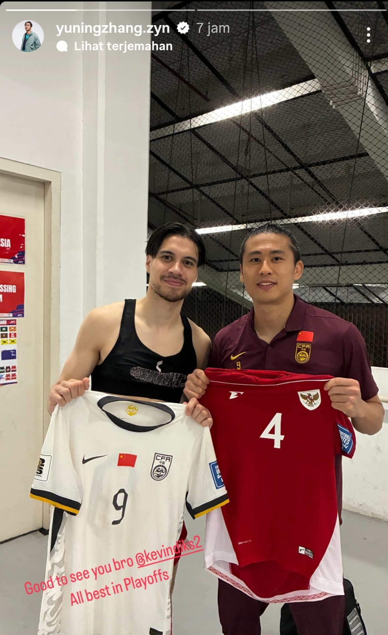 Usai pertandingan krusial tersebut, striker The Dragons, Zhang Yuning, bertukar jersey dengan bek Indonesia, Kevin Diks. Yuning juga mendoakan yang terbaik untuk Diks dan Indonesia di babak playoff.