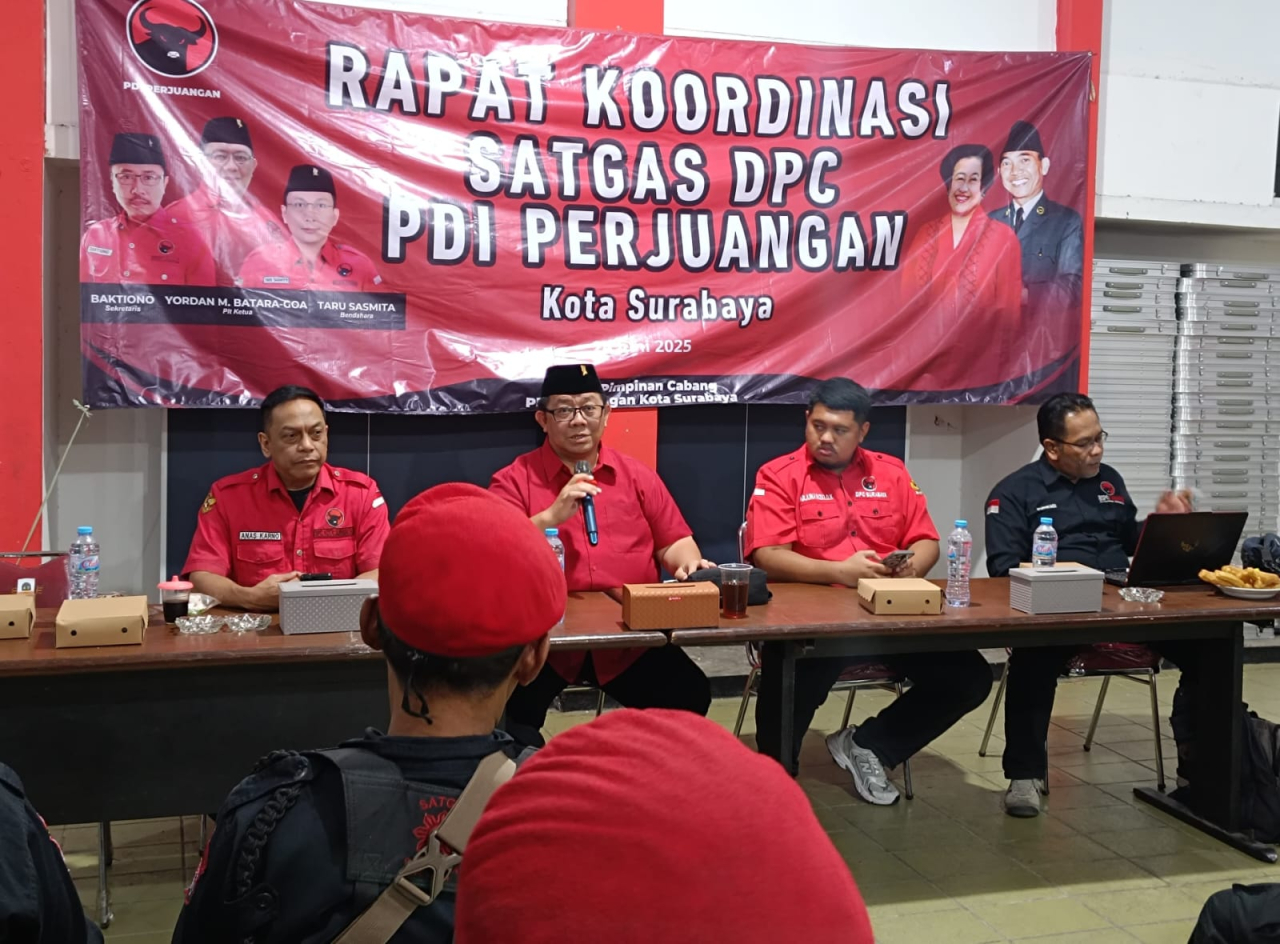 SURABAYA (Realita)- Satgas DPC PDIP Kota Surabaya menggelar rapat koordinasi di aula kantor BSPN DPC PDIP Surabaya Jl. Adityawarman, pada Selasa malam (24/6) malam. Rapat tersebut dipimpin Plt Ketua DPC PDIP Kota Surabaya Yordan M Bataragoa.