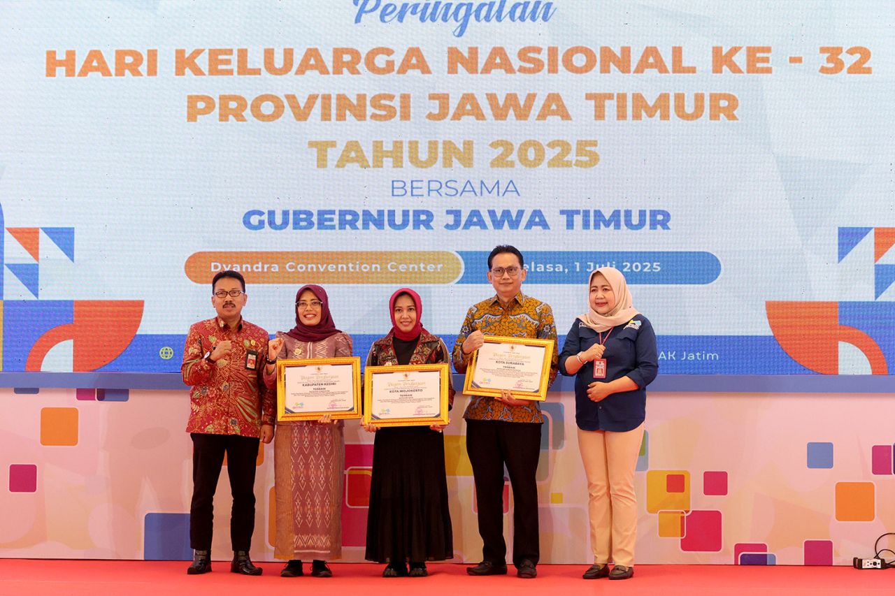 SURABAYA (Realita)— Kota Surabaya kembali membuktikan komitmennya dalam membangun ketahanan keluarga dengan meraih dua penghargaan sekaligus pada Peringatan Hari Keluarga Nasional (Harganas) ke-32 Provinsi Jawa Timur 2025. Penghargaan tersebut diserahkan langsung oleh Gubernur Jawa Timur kepada Pemerintah Kota (Pemkot) Surabaya di Dyandra Convention Center, Selasa (1/7/2025).