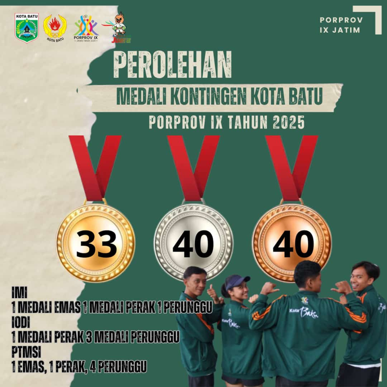 BATU (Realita)- Kontingen Kota Batu di akhir Pekan Olahraga Provinsi (Porprov) IX Jatim 2025 kali ini telah sukses cukup gemilang masuk ke 7 besar perolehan medali dan itu melampaui target yg di inginkan KONI Kota Batu yaitu bisa masuk ke 10 besar.
