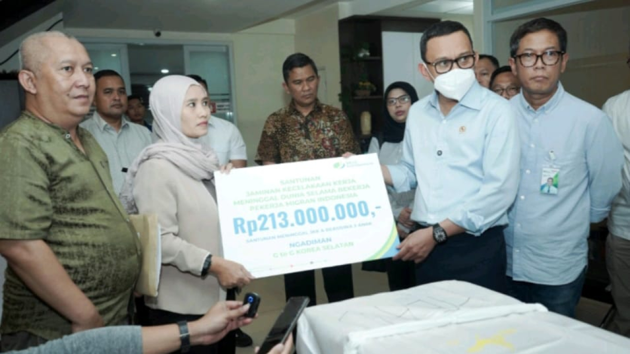 Selain menyerahkan jenazah kepada pihak keluarga, Menteri Karding sekaligus memberikan santunan meninggal karena kecelakaan kerja dan beasiswa bagi 2 orang anak dari BPJS Ketenagakerjaan senilai total Rp 213 juta.