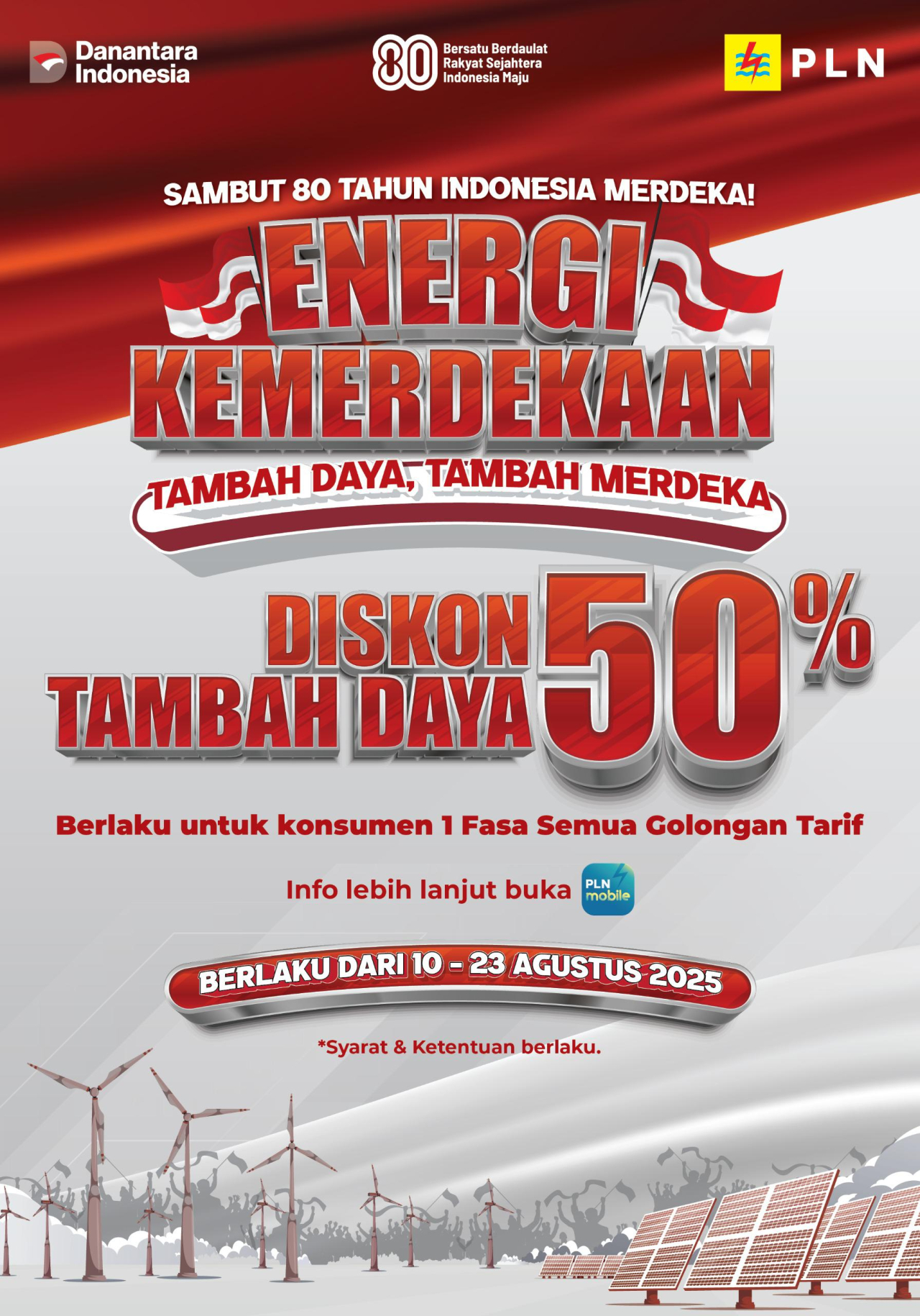 JAKARTA (Realita)– Dalam rangka menyemarakkan Hari Ulang Tahun ke-80 Kemerdekaan Republik Indonesia, PT PLN (Persero) menghadirkan program spesial bertajuk “Energi Kemerdekaan”. Melalui program ini, pelanggan dapat menikmati diskon tambah daya listrik 50% yang berlangsung mulai 10 hingga 23 Agustus 2025.