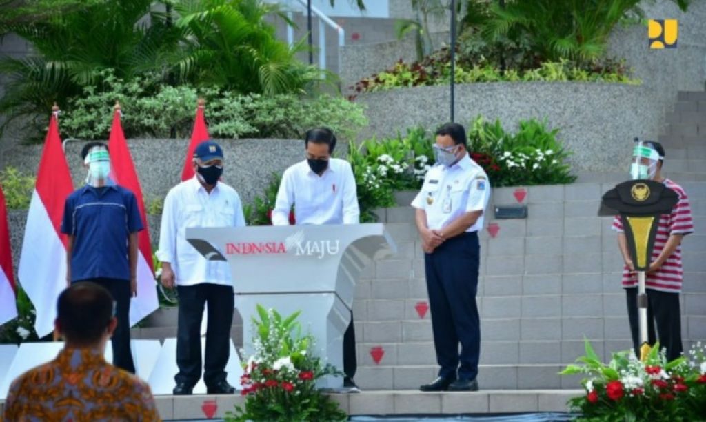 JAKARTA - Presiden Joko Widodo (Jokowi) meresmikan Rumah Susun (Rusun) Pasar Rumput beserta pasar/kios dan fasilitas pendukungnya untuk mendukung penyediaan rumah layak huni bagi Masyarakat Berpenghasilan Rendah (MBR) di Kota Jakarta Selatan, DK Jakarta. Prosesi peresmian ditandai dengan penandatanganan prasasti oleh Presiden Jokowi didampingi Menteri Pekerjaan Umum dan Perumahan Rakyat (PUPR) Basuki Hadimuljono, Gubernur DKI Anies Baswedan dan perwakilan pedagang pasar di Manggarai, Jakarta Selatan, Senin (20/9/2021).