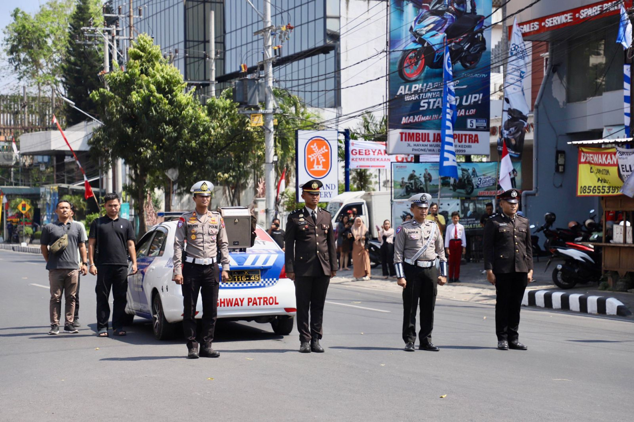 Kasat Lantas Polres Kediri Kota, AKP Afandy Dwi Takdir, menghimbau para pengendara yang melintas untuk berhenti sejenak.
