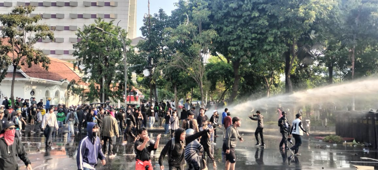 Sementara, petugas kepolisian gabungan asal Polrestabes Surabaya dan Polda Jatim yang standby di Halaman Gedung Negara Grahadi mencoba menenangkan massa aksi dengan menggunakan megaphone mengimbau agar aksi tidak anarkis lewat kendaraan taktis (rantis). Tampak pulq, petugas kepolisian menyemprotkan air water canon hingga gas air mata ke massa aksi yang terus anarkis.