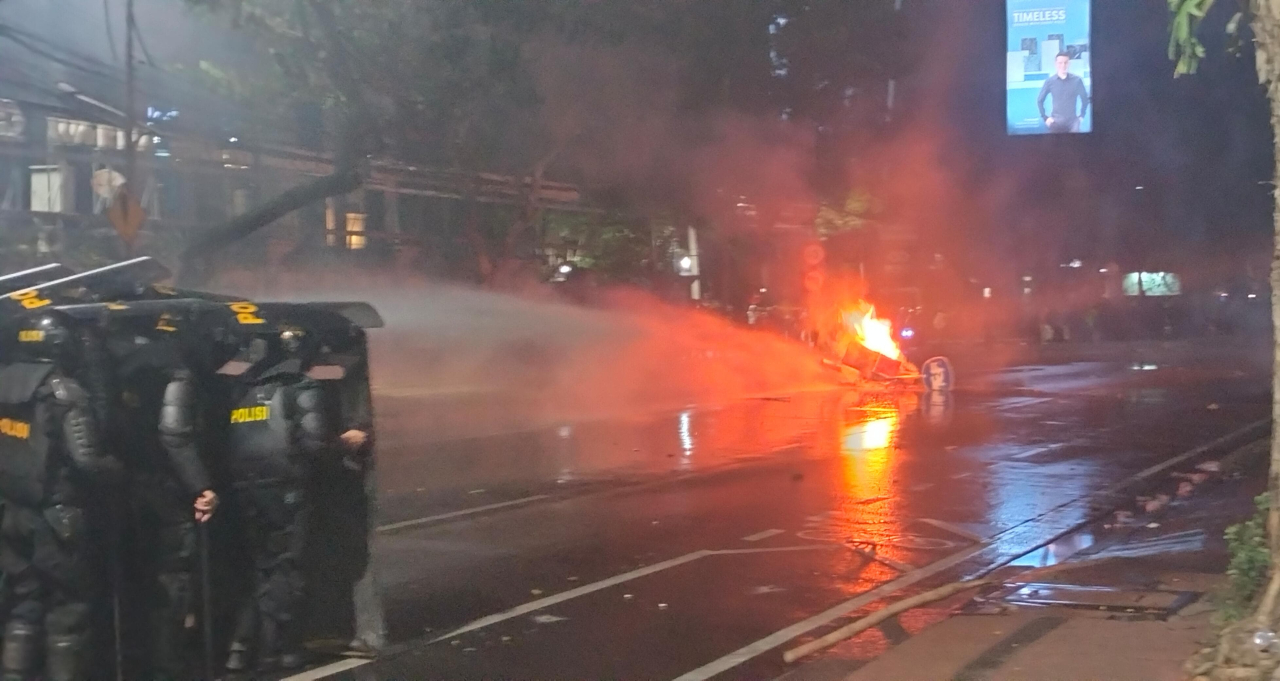 Massa yang di pukul mundur sempat melempar bom molotov ke arah aparat kepolisian. Petugas juga tampak menembakkan gas air mata disertai semprotan air dari water cannon.