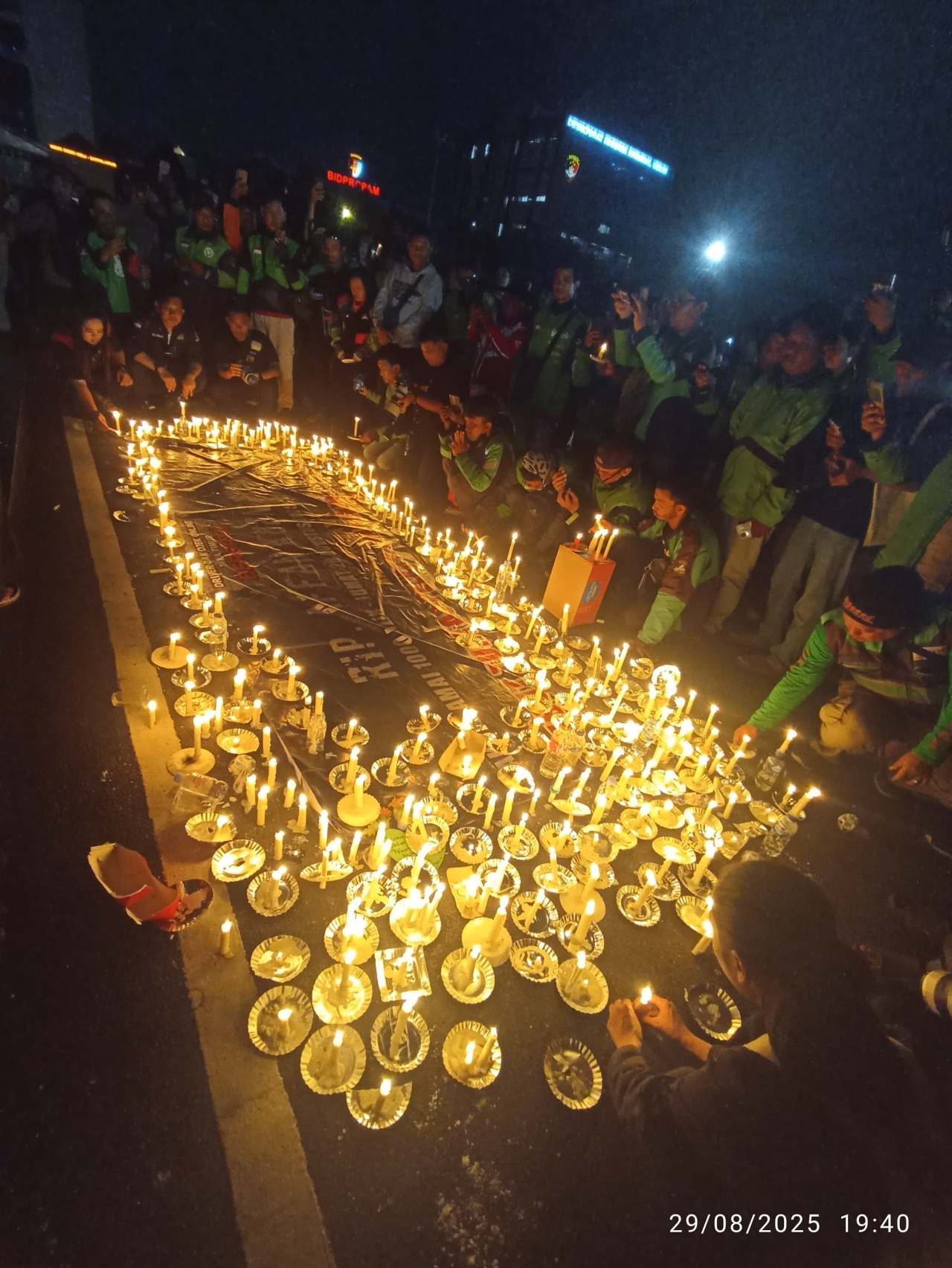 Selain melakukan doa bersama, para driver ojek online juga melakukan aksi menyalakan lilin dengan iringan lagu gugur bunga.