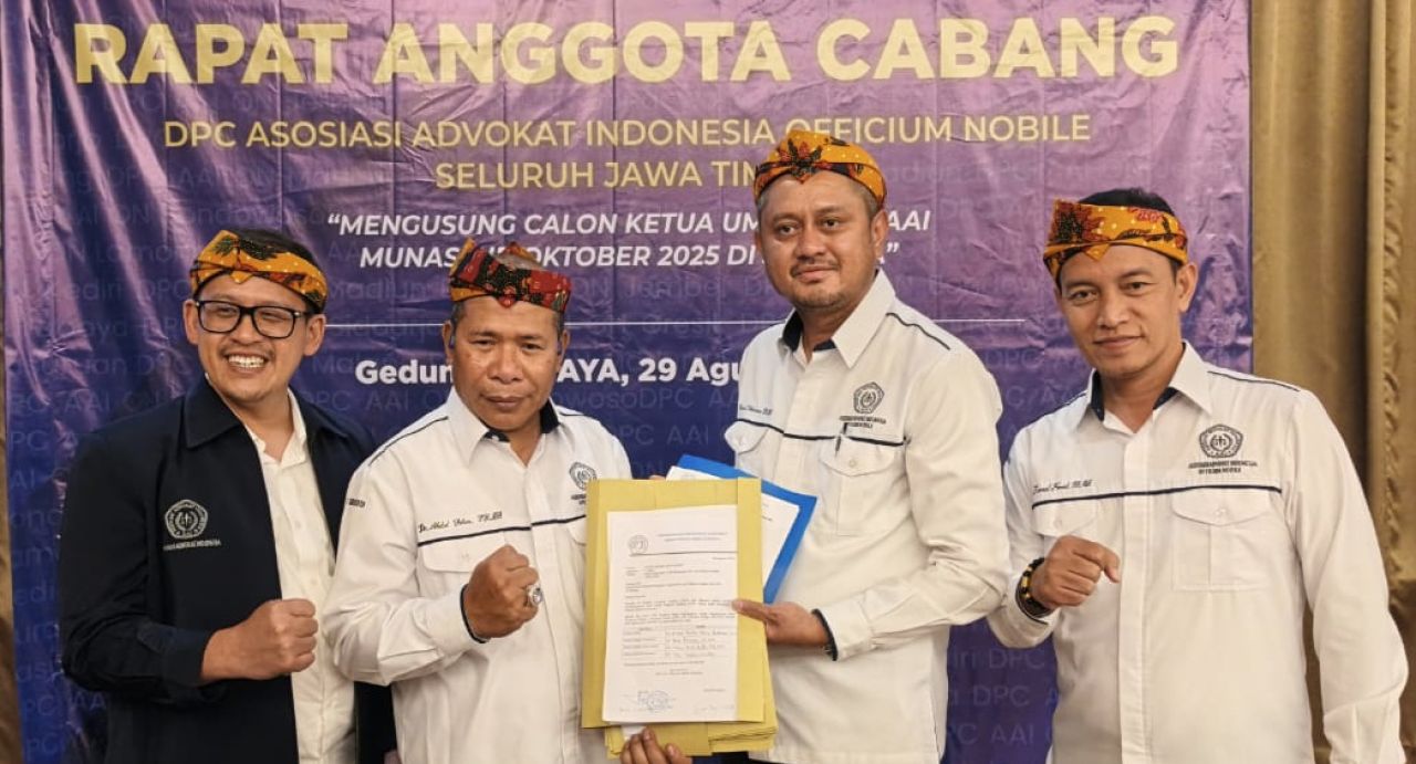 SURABAYA (Realita)– Sebanyak 12 Dewan Pimpinan Cabang (DPC) Asosiasi Advokat Indonesia Officium Nobile (AAI ON) Jawa Timur menyatakan dukungan penuh kepada Prof. Dr. KPHA Tjandra Sridjaja Pradjonggo, SH., MH untuk maju sebagai Ketua Umum AAI periode 2025–2030. Dukungan ini disepakati dalam rapat anggota cabang yang digelar di Gedung Sridjaja Surabaya, Jumat (29/8/2025).