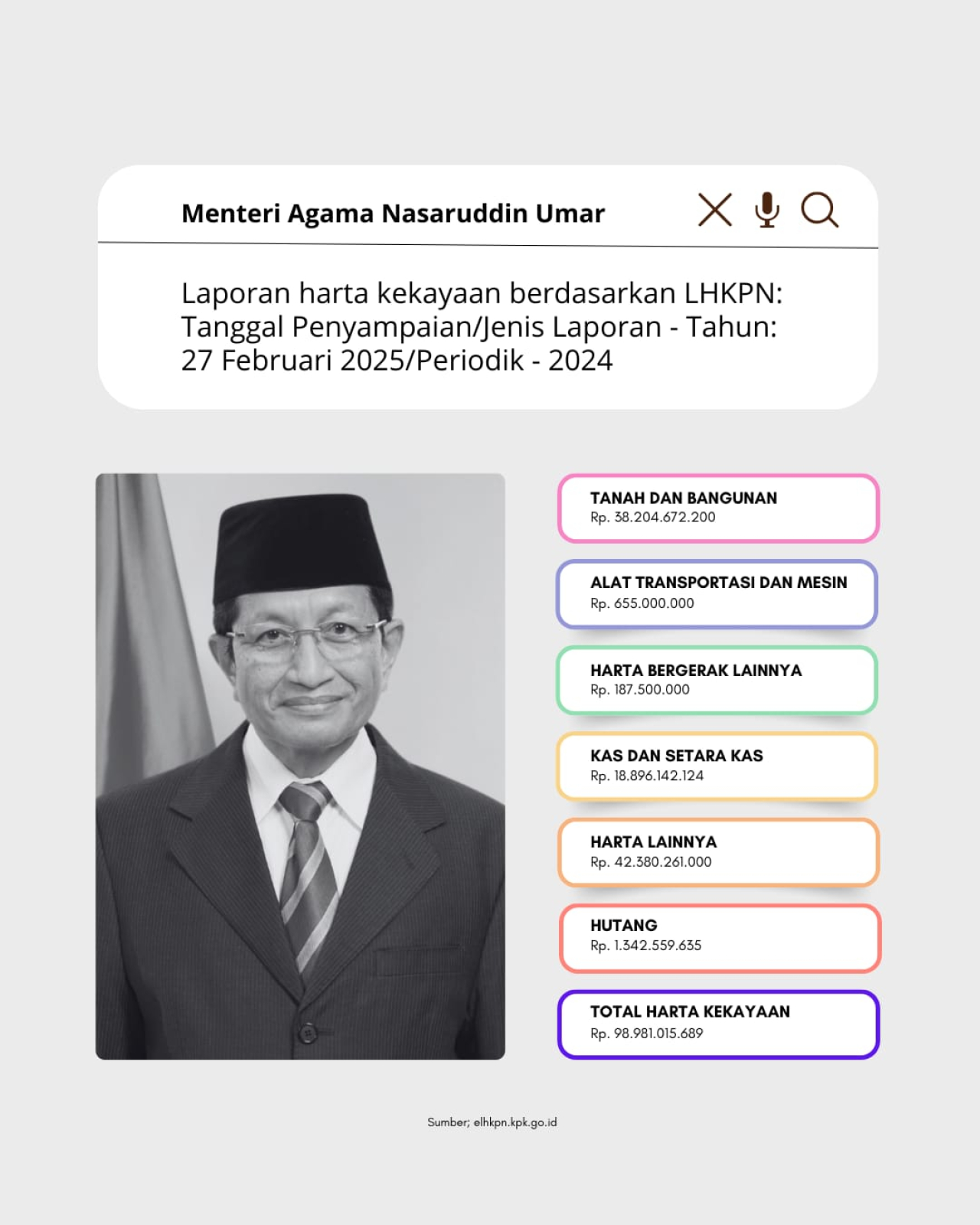 Kekayaan Menteri Agama (Menag) Nasaruddin Umar menjadi sorotan publik.