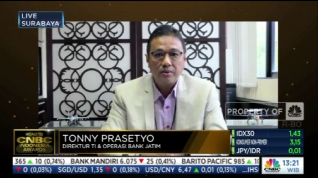Penghargaan tersebut diterima Direktur Teknologi Informasi & Operasi Bank Jatim Tonny Prasetyo di Studio CNBC Indonesia, Jakarta, Kamis (23/09/2021).