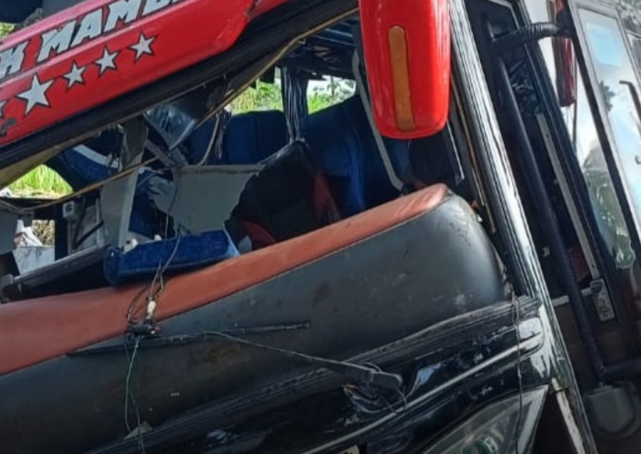 Imbas kecelakaan tunggal tersebut, bagian depan bus pun ringsek parah.
