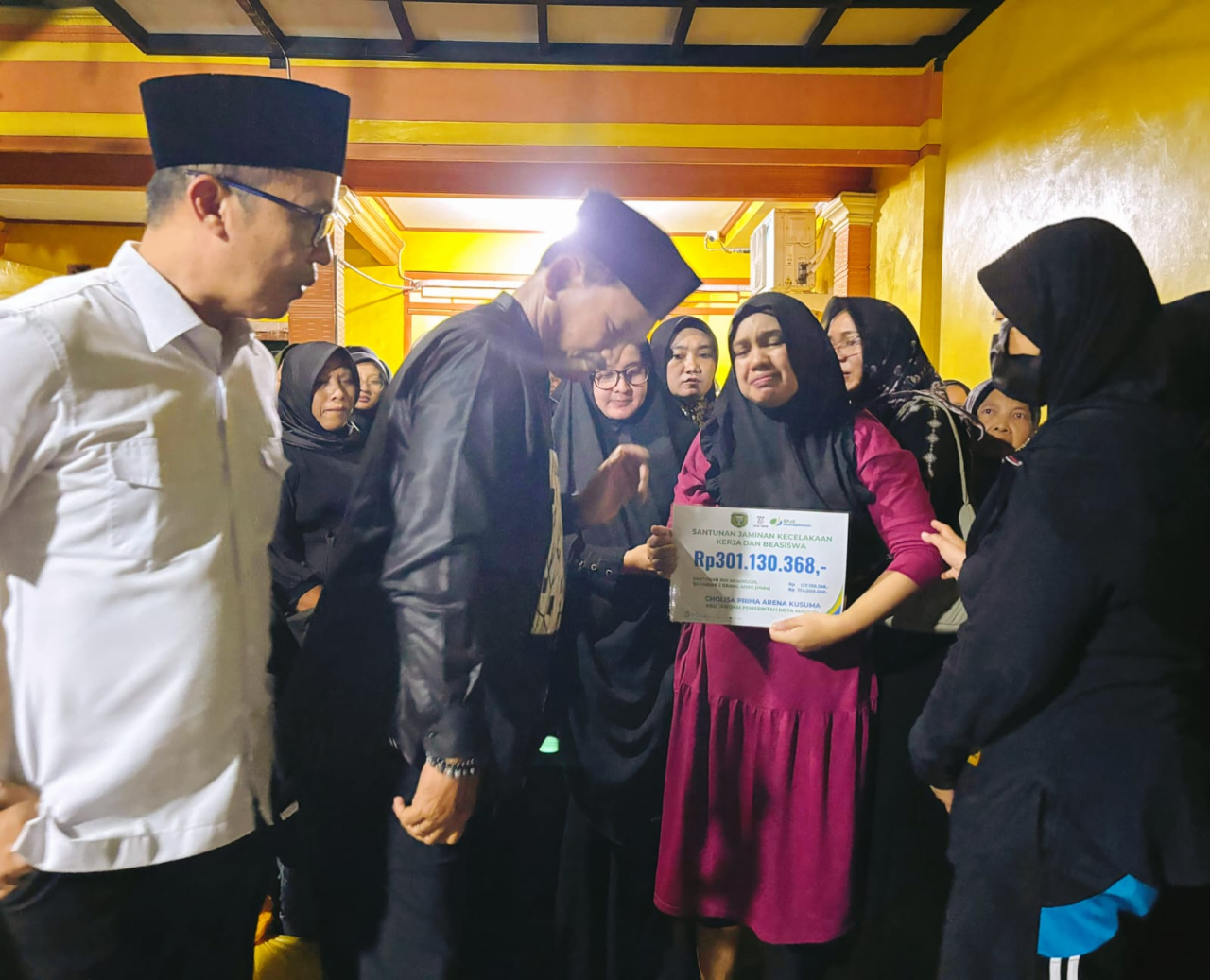 Dr.H Maidi, Walikota Madiun, dengan didampingi Kepala BPJS Ketenagakerjaan Madiun Anwar Hidayat, telah menyerahkan secara simbolis santunan sebesar Rp 301 juta kepada ahli waris dari Almarhum Cholisa Prima Arena Kusuma.
