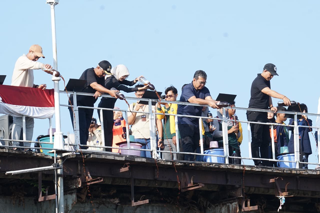 KEDIRI (Realita) - Memperingati World Cleanup Day 2025, Wali Kota Kediri, Vinanda Prameswati dan Wakil Wali Kota Kediri, Qowimuddin Thoha beserta jajaran menuangkan cairan eco enzym di Sungai Brantas, Sabtu, 20 September 2025.