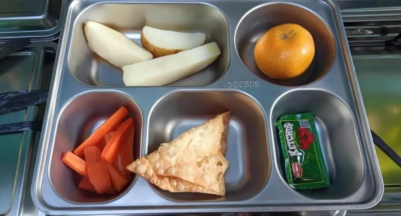 Dari unggahan yang beredar, terlihat menu terdiri dari potongan kentang rebus, wortel, kerupuk pangsit, jeruk, dan saus dalam kemasan sachet.
