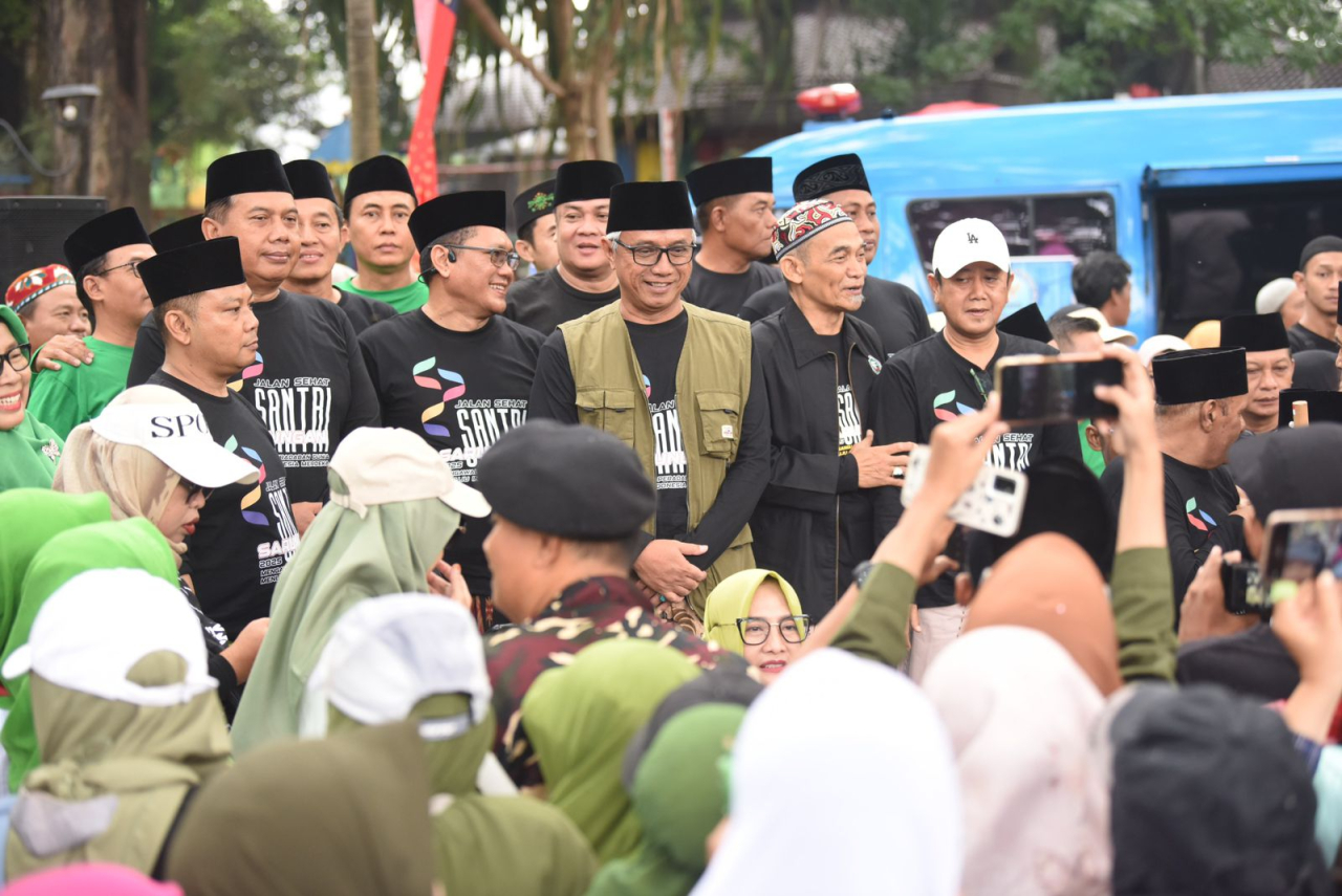 Para peserta antusias mengikuti Jalan Sehat Santri Sarungan yang diberangkatkan oleh Wakil Wali Kota Kediri, Qowimuddin Thoha, dalam rangka memperingati Hari Santri Nasional 2025.