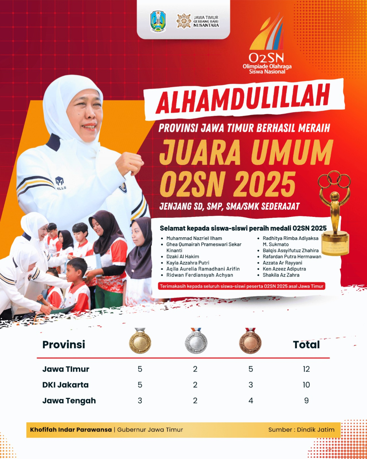 Dalam perhelatan O2SN 2025, Jawa Timur berhasil mengungguli provinsi-provinsi lain seperti DKI Jakarta (10 medali), Jawa Tengah (9 medali), Banten (4 medali), dan DIY (4 medali). Capaian ini semakin menguatkan posisi Jatim sebagai salah satu daerah dengan ekosistem pendidikan dan keolahragaan terbaik di Indonesia.