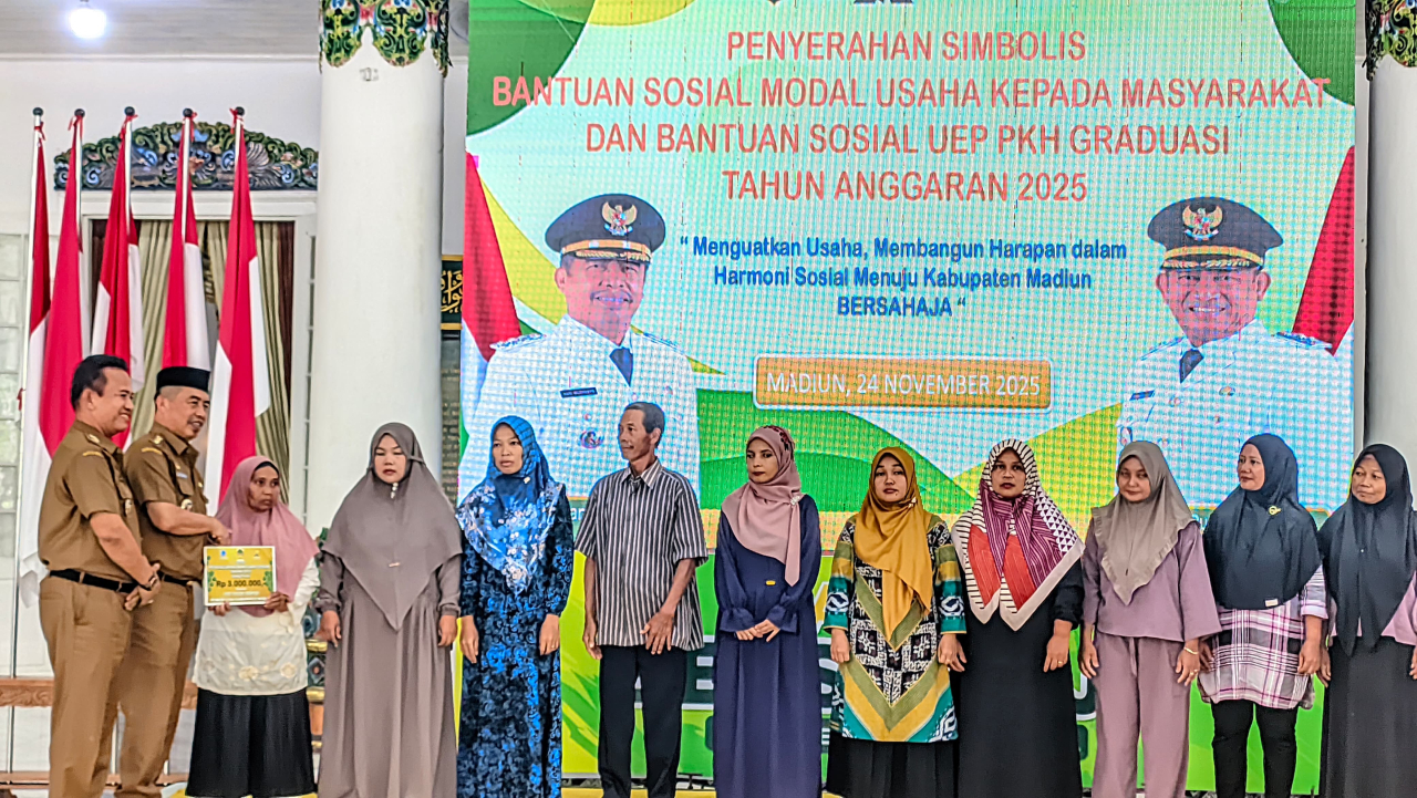 MADIUN (Realita) - Pemerintah Kabupaten Madiun resmi menyalurkan bantuan sosial berupa modal usaha dan bantuan Program Keluarga Harapan (PKH) Graduasi kepada 130 penerima manfaat. Penyerahan bantuan dilakukan secara simbolis oleh Bupati Madiun, Hari Wuryanto, didampingi Wakil Bupati, dr. Purnomo Hadi, serta Kepala Dinas Sosial Kabupaten Madiun di Pendopo Muda Graha pada Senin, (24 November 2025).