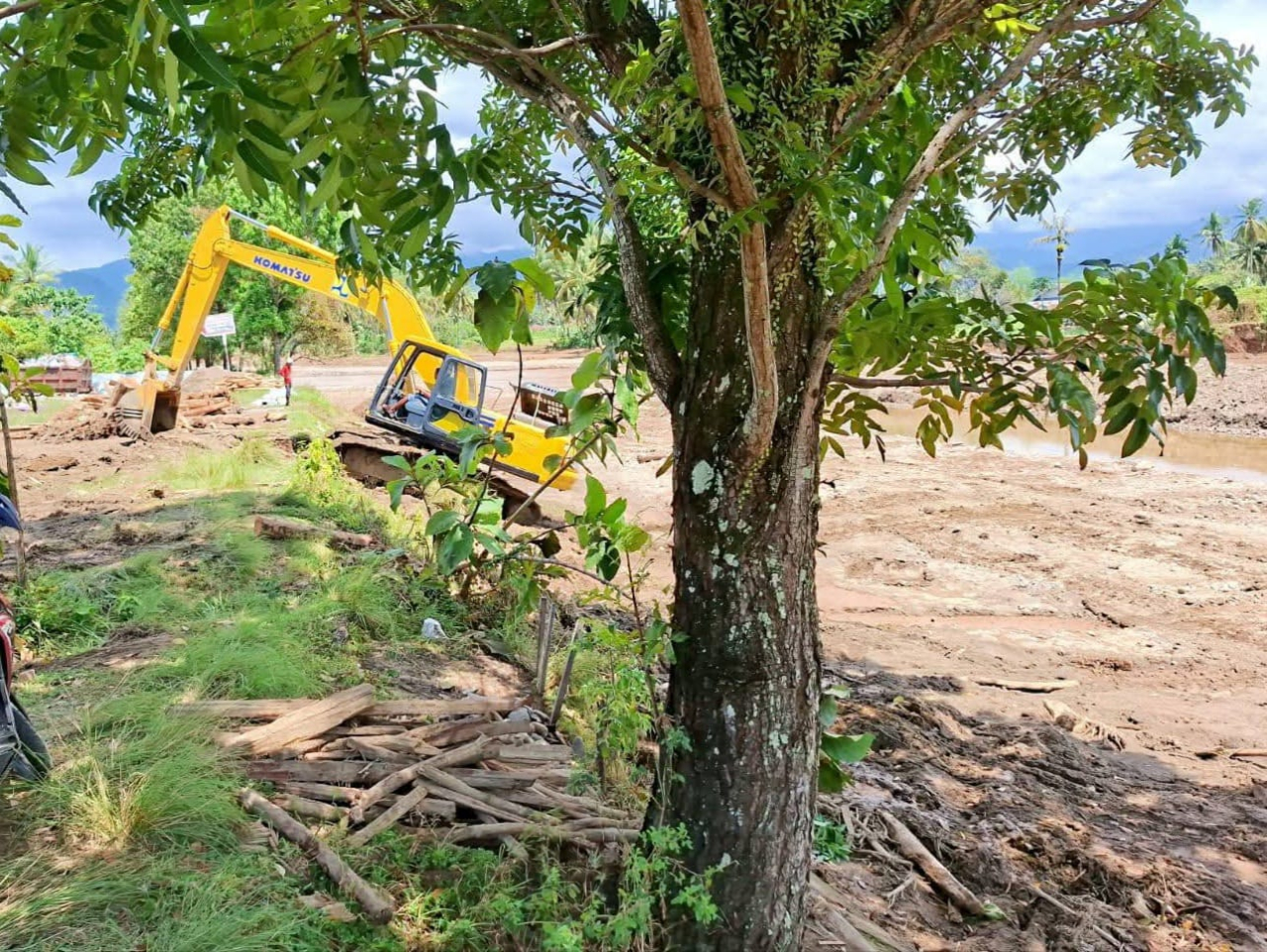 Untuk mempercepat penanganan, dua unit ekskavator dikerahkan ke lokasi sejak pagi. Alat berat ini bekerja mengangkat kayu-kayu besar, menggali sedimen pasir, dan memindahkan material ke sisi sungai agar aliran air dapat kembali normal.