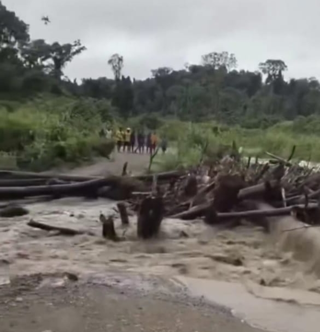 Sejumlah warga terlihat berkumpul di bantaran sungai untuk menyaksikan tumpukan kayu yang hanyut terbawa arus. Material kayu berukuran besar tersebut dinilai berpotensi membahayakan keselamatan, terutama jika tersangkut di jembatan atau menghantam rumah warga yang berada dekat aliran sungai.