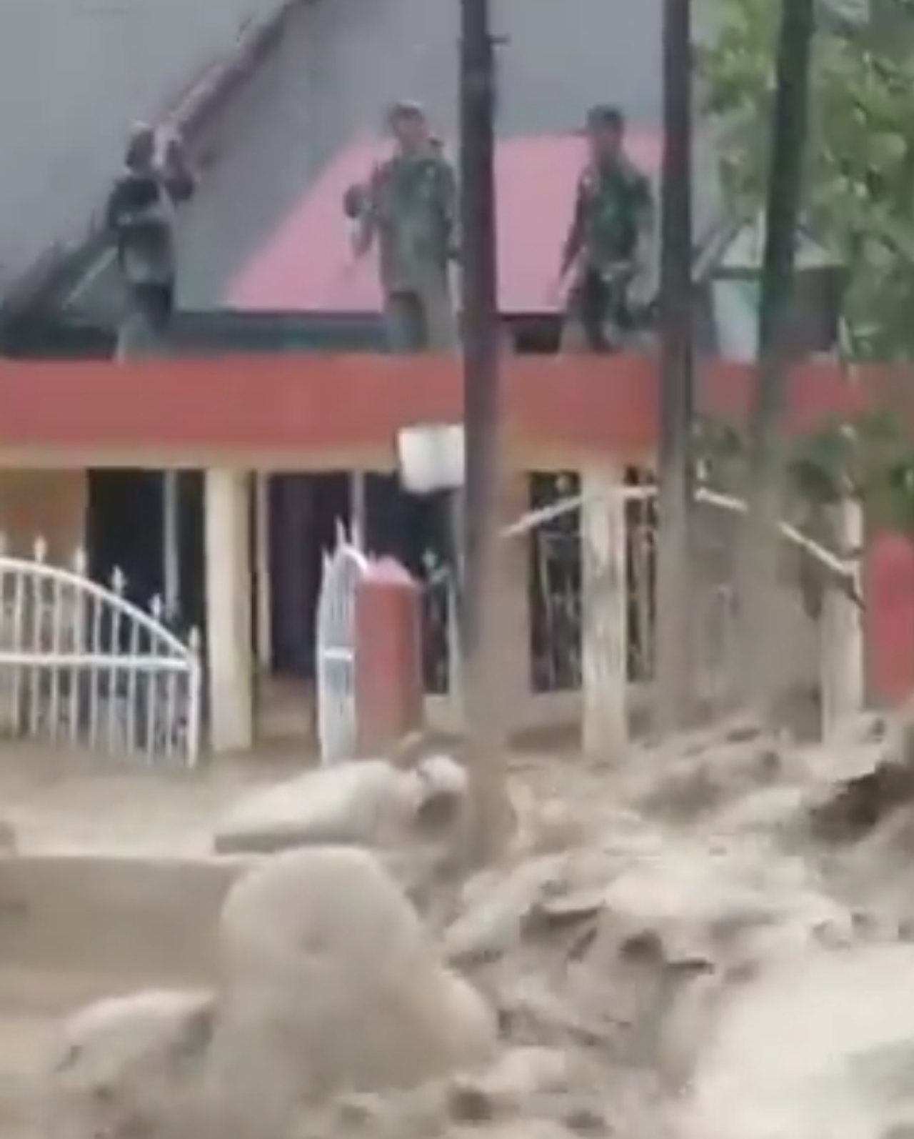 Curah hujan yang ekstrem memicu luapan hebat Sungai Muaro Pisang hingga memaksa sejumlah prajurit TNI yang sedang bersiaga memanjat pagar dan naik ke atap rumah warga untuk menyelamatkan diri dari terjangan arus.
