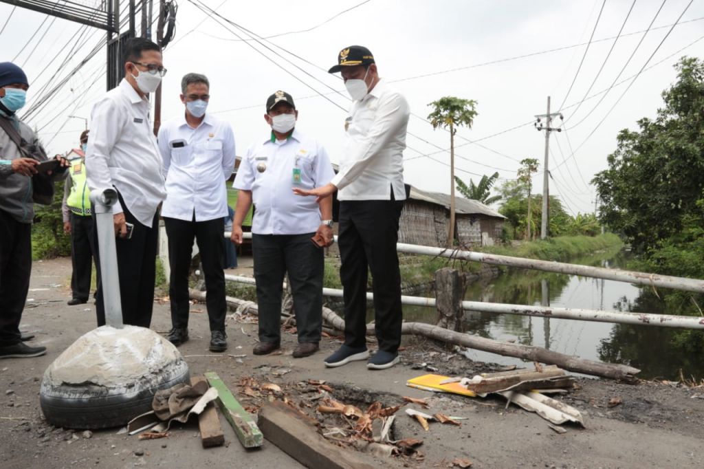 SIDOARJO (Realita)- Wakil Bupati Sidoarjo Subandi mengecek Jembatan penghubung antara Desa Semampir Kecamatan Sedati dan Desa Tambak Sawah Kecamatan Waru. Jembatan yang menghubungkan dua desa itu dilaporkan rusak berlubang sehingga membahayakan pengendara yang lewat. Saat mengecek Subandi didamping Asisten Administrasi Perekonomian dan Pembangunan Benny Airlangga Yogaswara dan Plt. Kepala Dinas PU Bina Marga dan Sumber Daya Air Kabupaten Sidoarjo Sigit Setyawan. Rabu (6/10/2021).
