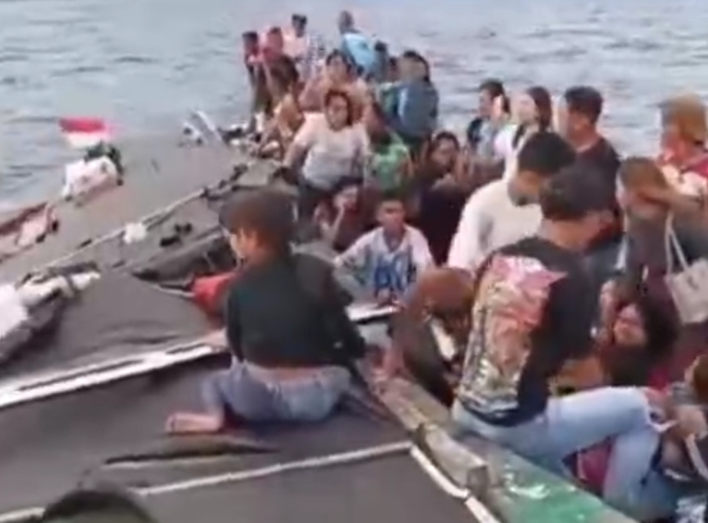 Momen paling menyayat hati terlihat saat puluhan penumpang bertahan di atap perahu, sementara para orang tua tampak memeluk erat anak-anak mereka di tengah kepanikan.